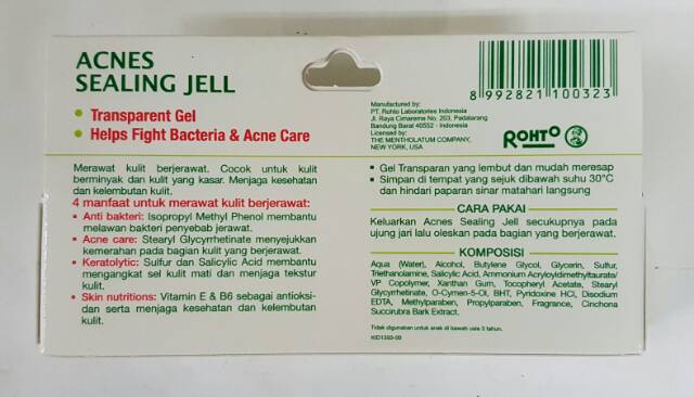 It exfoliates dead skin cells controls excess sebum removes acne-causing bacteria to make skin clear and acne-free. Description A clear non-sticky gel with anti-imperfection technology to help fight and clear acne. Salicylic Acid Isopropylmethylphenol. A clear non-sticky gel with anti-imperfection technology to help fight and clear acne. Can soften skin and promote rapid flaking old skin. Powered with oil-absorber Sulfur that extracts the excessive sebum and oil. With Acne Care Ingredients. Zat aktif yang menjadi kandungan acnes sealing jell di antaranya isopropil metil fenol asam salisilat dan sulfur yang berfungsi untuk mengatasi masalah jerawat. Containing 25 w w Sulfur treatment for acne.